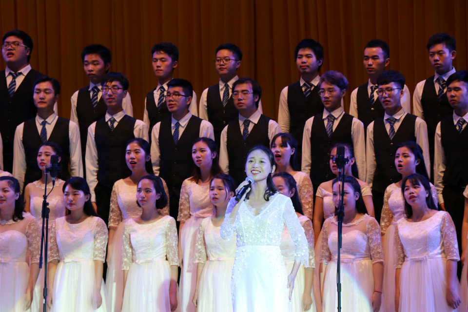 晚上7点,陈嘉庚纪念堂一楼大厅人声鼎沸、全场座无虚席,比赛在现场热烈的气氛中拉开了帷幕。主持人介绍完评委和嘉宾后,比赛正式开始。历时几个月的训练,每个上场的队伍都拿出了自己最好的状态,准备给在场观众带来一场精彩纷呈的视听盛宴。其中,由兰萌老师带领的365bet网址阳光合唱团于第十一个登场,高贵简洁的装束与深情婉转的歌声瞬间抓住了所有人的目光,动人心魄。首先演唱的曲目是《蒲公英》,曲调时而欢快时而低沉,台上的同学声情并茂、声音洪亮,指挥员手势准确、富有激情,仿佛眼前就是飘洒在空中的蒲公英,感受着它的喜怒哀乐。小提琴声响起,合唱团成员带来了今晚的第二首曲目是原创改编后的《好儿好女好江山》,由兰萌老师领唱,用熟悉的旋律演绎了时代的激越,瞬间将现场气氛推向了高潮,赢得现场观众的阵阵掌声。