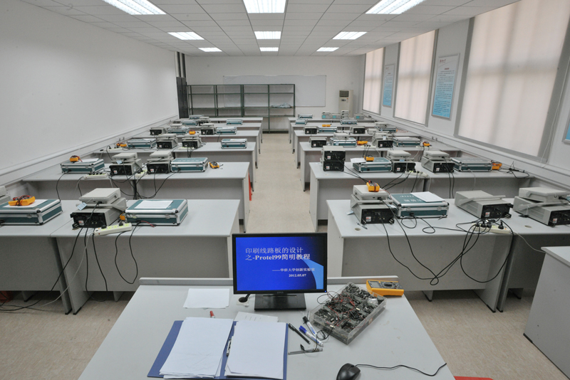 电子基础实验室现有实验用房面积100平方米,同时可以容纳50名学生进行实验操作。实验室布局合理,整齐有序;通风、照明、温湿度、水、电等布局规范、合理、安全;防火、防爆、防盗的基本设备和措施齐全,符合安全、卫生、环保等要求。实验室备有充足专业实验仪器设备供基础实验课的教学、科研使用。仪器设备的保管、维护、维修规范,实验设备的帐物卡相符率达到100% ,实验设备的完好率均保持在90%以上。