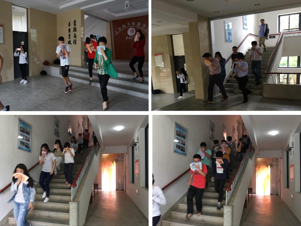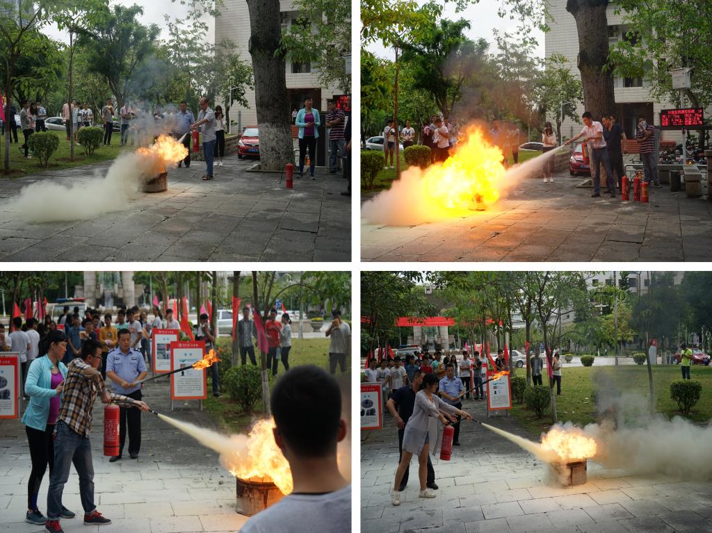 演练分为火灾逃生演练和油盆灭火训练,逃生演练要求一旦发现火情,火灾警报响起,在场人员要立即引导室内人员进行有序疏散,演练过程使用烟雾弹模拟了火情,增加了演练的真实性,整个过程紧张有序。随后还进行消防灭火演练,利用灭火器对油盆内的火焰进行灭火,教师及学生代表都进行了实际操作,保卫处人员指导灭火技巧,方便日后出现突发状况时可以沉着应对并利用室内的消防器材控制火情。演练结束后还组织老师及同学观看相关安全事故的展板,加强安全责任意识。