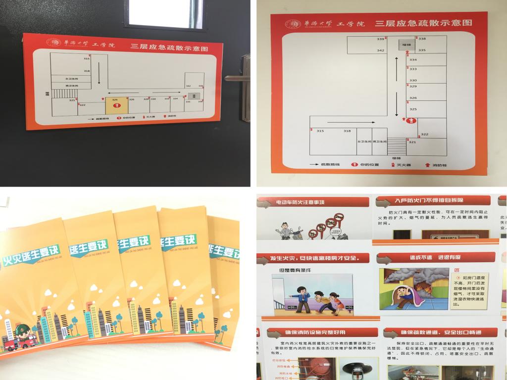 在学院教学楼中安装警铃,为全院办公室及实验室配备防火平面图和紧急疏散路线图, 方便师生在突发紧急状况时能够秩序井然地离开,避免发生衍生事故。